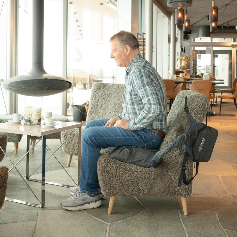 Portabelt – Kan brukes i godstolen og flyttes til andre stoler eller seter ved behov. Kan enkelt tas med på tur utenfor hjemmet i den medfølgende ryggsekken. Drives av batteri, og er dermed ikke avhengig av stikkontakt. Det oppladbare batteriet varer i ca. 4-7 dager ved normal bruk.